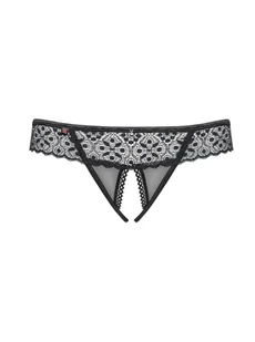 - odważne, seksowne stringi - otwarty krok – gwarancja wyjątkowo przyjemnych doznań! - geometryczny wzór koronki – piękny i intrygujący - elastyczne paseczki – dopasowują się do ciała - ozdobna zawieszka – elegancki detal - pikantne wycięcie na pośladkach - miłe w dotyku i elastyczne materiały (90% poliamid, 10% elastan)