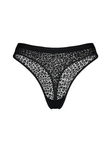 Majtki stringi Desire Bloovii | czarny Te stringi to połączenie wyrazistego designu i lekkiej, nowoczesnej formy. Przód wykonano z delikatnego, półprzezroczystego meshu z welurowym wzorem panterki, który nadaje całości drapieżnego, a jednocześnie eleganckiego charakteru. Czerń podkreśla wzór i sprawia, że model prezentuje się wyjątkowo stylowo. Z tyłu fason subtelnie odsłania pośladki, zachowując przy tym komfort noszenia. Elastyczna, delikatnie połyskująca gumka w talii z dyskretnym napisem BLOOVII (ton w ton) dobrze dopasowuje się do sylwetki i stanowi modny detal.