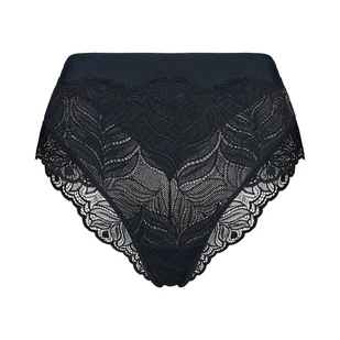 Majtki z wyższym stanem AURORA Esotiq | czarny Eleganckie majtki AURORA w czarnym kolorze to połączenie zmysłowej estetyki i komfortu noszenia. Model z podwyższonym stanem subtelnie podkreśla talię, zapewniając jednocześnie poczucie wygody i lekkości przez cały dzień. Przód wykonany jest z gładkiej, miękkiej mikrofibry o delikatnym, satynowym wykończeniu, która harmonijnie łączy się z efektowną koronką o motywie liści. Transparentne elementy dodają całości lekkości i finezji, delikatnie zdobiąc linię bioder. Tył majtek zachwyca połączeniem gładkiej tkaniny z dekoracyjną koronką, która efektownie układa się na pośladkach.