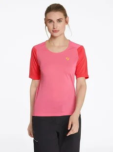 Koszulka kolarska "Nestonia" w kolorze różowo-czerwonym - siateczkowe wstawki: tak - szybkoschnący materiał - oddychalność - dekolt: okrągły - zasuwane kieszenie boczne - detale: haft z logo - krój: dłuższe plecy - look: