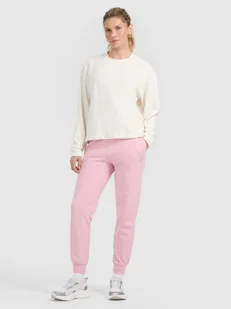 Dresy 4F dla kobiety są wykonane w 79% z bawełny, dzięki czemu są miękkie, trwałe i przyjemne w dotyku. Dodatek poliestru (21%) sprawia, że materiał utrzymuje fason i jest odporny na zużycie nawet przez wiele sezonów. Spodnie nie posiadają podszycia, dzięki czemu są lżejsze i odpowiednie na cieplejsze dni. Po bokach znajdują się 2 kieszenie otwarte. Elastyczny pas z wewnętrzną regulacją na troki.