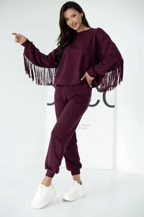 Modny Dwuczęściowy Dres Damski z Frędzlami - Kolor Bordowy / Śliwkowy Odkryj nasz wyjątkowy komplet dresowy, który łączy sportowy komfort z najnowszymi trendami mody! Idealny na co dzień, na spacer, czy spotkanie ze znajomymi. Wyróżnij się stylem! Główne Cechy Produktu: Unikatowy Design: Efektowne, długie frędzle wszyte wzdłuż rękawów i na plecach bluzy nadają kompletowi charakteru i modowego pazura. Wygoda i Komfort: