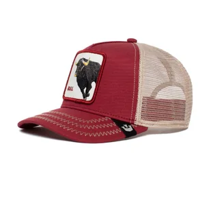 Daszek czapki ozdobiony został kontrastowymi szwami. Na przodzie znajduje się oryginalna naszywka w postaci byka - idealna dla miłośników zwierząt. Na daszku widnieje żakardowa metka z logo marki Goorin. Model dwukolorowy: czerwony daszek oraz panel przedni, beżowa siateczka.