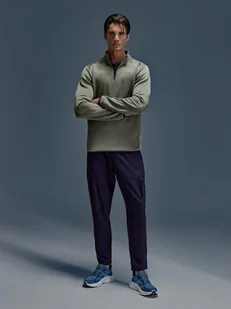 Posiadają krój regular, który wygodnie dopasowuje się do sylwetki oraz zwężane nogawki bez ściągacza i regulacji. Splot z obu stron dzianiny interlock jest taki sam. Materiał jest wytrzymały, ale jednocześnie miękki, dobrze się układa i chłonie wilgoć. Spodnie do treningu są wykonane z materiału syntetycznego, który zapewnia trwałość i jest łatwy w pielęgnacji. Dzięki dodatkowi elastanu (8%) są rozciągliwe i wygodnie układają się na sylwetce.