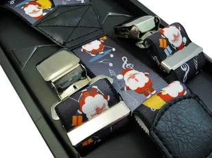 Kolorowe świąteczne szelki do spodni - Mikołaje SZ71 Szare szelki w świąteczny wzór - Mikołaje. Super cena! Polski producent! Modne stalowe żabki Silne mocowanie Najwyższej jakości drukowana guma galanteryjna Elastyczne taśmy o szerokości 4 cm Skórzane łączenia Regulacja: 75-110 cm. Wygodne i uniwersalne. Idealne na prezent! Cechy produktu: Wzór: Inny Dominujący kolor: