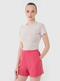 Dodatek poliestru (40%) sprawia, że materiał utrzymuje fason i jest odporny na zużycie nawet przez wiele sezonów. Spodenki nie posiadają podszycia, dzięki czemu są lżejsze i bardziej przewiewne. Po bokach znajdują się 2 kieszenie otwarte. Elastyczny pas bez regulacji. Krótkie spodenki materiałowe dla kobiety - CECHY: