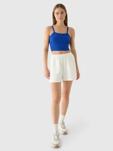 Szorty dresowe damskie wykonane z dzianiny o średniej gramaturze 300 gsm, która sprawia, że są one miękkie oraz bardziej przewiewne. Spodenki nie posiadają podszycia, dzięki czemu są lżejsze i bardziej przewiewne. Po bokach znajdują się 2 kieszenie otwarte. Elastyczny pas bez regulacji. Sprawdź: Spodnie dresowe - to musisz wiedzieć Krótkie spodenki dresowe dla kobiety - CECHY: