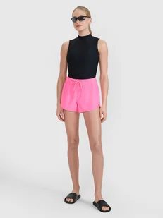 Szorty na plażę damskie wykonane z materiału o średniej gramaturze 120 gsm, która sprawia, że są one bardzo lekkie. Spodenki nie posiadają podszycia. Wykonane w technologii 4Way Stretch, która sprawia, że materiał rozciąga się we wszystkich kierunkach (w pionie i poziomie). Bez kieszeni. Guma w pasie zapewnia wygodne dopasowanie.