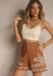 Brązowe Szorty High Waist z Bawełny Zdobione Haftem Filianira