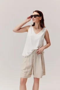 Najważniejsze cechy: Skład: 69% wiskoza, 30% len, 1% metal; Luźny, komfortowy fason; Wysoki stan z elastycznym pasem; Zapięcie na guzik i suwak; Delikatny wzór w pionowe paski; Przewiewna i lekka tkanina z naturalnym wykończeniem; Opis produktu: Stylowe szorty z mieszanki lnu i wiskozy to must-have na ciepłe dni; Dzięki przewiewnej tkaninie i luźnemu fasonowi zapewniają komfort noszenia i swobodę ruchów; Subtelny wzór w paski nadaje im eleganckiego charakteru, dzięki czemu sprawdzą się zarówno w casualowych stylizacjach z prostym topem, jak i w bardziej eleganckich zestawieniach – na przykład z dopasowaną marynarką. Szyte w Polsce. Skład: 69% wiskoza, 30% len, 1% metal Wymiary produktu dla rozmiaru 34: