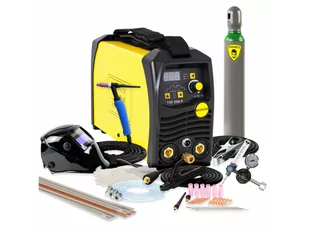 Wyposażenie standardowe: urządzenie spawalnicze uchwyt TIG SR 26 / 4,0 m przewód elektrodowy z uchwytem MMA przewód masowy z zaciskiem instrukcja obsługi w języku polskim Pakiet akcesoriów 1: reduktor gazu z rotametrem butla ARGON 8 litrów (nowa, pełna, 10-letnia legalizacja, kołpak chroniący zawór) rękawice spawalnicze 1 para elektroda wolframowa fi 1,6 / 2,0 / 2,4 mm / po 2 szt. każdej tulejka zaciskowa fi 1,6 / 2,0 / 2,4 mm / po 2 szt. każdej łącznik prądowy fi 1,6 / 2,0 / 2,4 mm / po 2 szt.