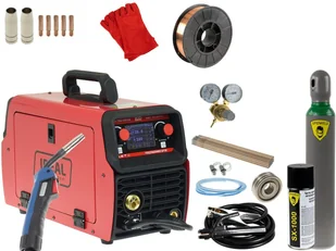 urządzenie spawalnicze uchwyt spawalniczy MB-15 / 3,0 m  przewód masowy / wtyk 35-50 mm2 / 2,5 m przewód elektrodowy / wtyk 35-50 mm2 / 200 A / 2,5 m rolka podajnika na drut fi 0,8/1,0 mm (zamontowana w podajniku) wkład stalowy do drutu 0,8/1,0 mm (zamontowany w uchwycie) przewód zasilający z wtyczką instrukcja w języku polskim Pakiet akcesoriów 1: preparat antyodpryskowy 400 ml drut spawalniczy samoosłonowy FLUX 0,8 mm / 0,9 kg rękawice spawalnicze 1 para dysza gazowa 2 szt. końcówka prądowa 5 szt. elektrody spawalnicze rutylowe / 1,0 kg Pakiet akcesoriów 2: preparat antyodpryskowy 400 ml drut spawalniczy SG2 0,8 mm / 5,0 kg reduktor gazu MINI 2 manometry butla z mieszanką ARG/CO2 8 litrów (nowa, pełna, 10-letnia legalizacja, kołpak chroniący zawór) rękawice spawalnicze 1 para dysza gazowa 2 szt.