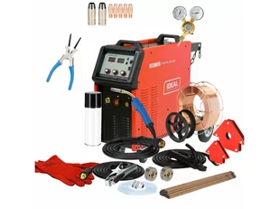 preparat antyodpryskowy 400 ml  drut spawalniczy SG2 1,0 mm / 15,0 kg  reduktor duży ARG/CO2 z dwoma manometrami  rękawice spawalnicze 1 para  dysza gazowa 2 szt. końcówka prądowa 5 szt. elektrody spawalnicze rutylowe / 1,0 kg  kątownik magnetyczny 11,0 kg  kątownik magnetyczny 22,0 kg  szczypce spawalnicze  adapter szpuli drutu  wąż do podłączenia gazu + opaski zaciskowe  Pakiet akcesoriów 2: preparat antyodpryskowy 400 ml  drut spawalniczy SG2 1,0 mm / 15,0 kg  reduktor duży ARG/CO2 z dwoma manometrami  butla z mieszanką ARG/CO2 8 litrów (nowa, pełna, 10-letnia legalizacja, kołpak chroniący zawór)  rękawice spawalnicze 1 para  dysza gazowa 2 szt. końcówka prądowa 5 szt.
