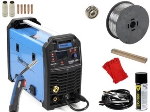 Główne cechy: sterowanie cyfrowe Arc Force Hot Start 2T/4T VRD Anti Stick spawanie punktowe TIG Lift regulacja indukcyjności podajnik 2-rolkowy opcja Spool Gun pamięć ostatniego ustawienia MIG ręczny MIG synergiczny MMA MMA Pulse TIG Lift spawanie bez gazu Urządzenie wykonane jest w technologii IGBT pozwalającej na znaczną redukcję masy i gabarytów spawarki oraz wzrost wydajności przy jednoczesnym obniżeniu zużycia energii. Wyposażenie standardowe: uchwyt spawalniczy MIG TW-15 / 3 m przewód masowy przewód elektrodowy rolka podajnika drutu 0,8 / 1,0 mm (zamontowana) wkład stalowy do uchwytu (zamontowany) instrukcja obsługi w języku polskim Pakiet akcesoriów 1: preparat antyodpryskowy 400 ml drut spawalniczy samoosłonowy FLUX 0,8 mm / 0,9 kg rękawice spawalnicze 1 para dysza gazowa 2 szt.