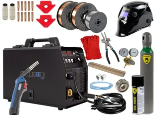elektrody spawalnicze rutylowe / 1,0 kg Pakiet akcesoriów 2: preparat antyodpryskowy 400 ml drut spawalniczy SG2 0,8 mm / 5,0 kg reduktor gazu MINI 2 manometry butla z mieszanką ARG/CO2 8 litrów (nowa, pełna, 10-letnia legalizacja, kołpak chroniący zawór) rękawice spawalnicze 1 para dysza gazowa 2 szt. końcówka prądowa 5 szt. elektrody spawalnicze rutylowe / 1,0 kg wąż do podłączenia butli z reduktorem + opaski Pakiet akcesoriów 3: przyłbica samościemniająca 510G preparat antyodpryskowy 400 ml drut spawalniczy SG2 0,8 mm / 5,0 kg reduktor gazu MINI 2 manometry butla z mieszanką ARG/CO2 8 litrów (nowa, pełna, 10-letnia legalizacja, kołpak chroniący zawór) rękawice spawalnicze 1 para dysza gazowa 2 szt.
