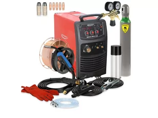 końcówka prądowa 5 szt. Pakiet akcesoriów 2: butla z mieszanką ARG/CO2 8 litrów (nowa, pełna, 10-letnia legalizacja, kołpak chroniący zawór) reduktor duży ARG/CO2 z dwoma manometrami drut spawalniczy SG2 1,0 mm / 15,0 kg adapter szpuli drutu rękawice spawalnicze 1 para preparat antyodpryskowy 400 ml dysza gazowa 2 szt. końcówka prądowa 5 szt. wąż do podłączenia gazu + opaski zaciskowe Pakiet akcesoriów 3: