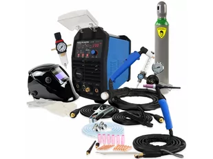 W komplecie znajdują się uchwyt spawalniczy TIG, uchwyt do cięcia plazmowego PT-31, przewód elektrodowy, przewód masowy oraz zewnętrzny zespół przygotowania powietrza do cięcia plazmowego. Cechy produktu: połączenie funkcji spawarki TIG / MMA i przecinarki plazmowej