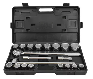Skład zestawu: grzechotka 3/4" (długość całkowita 495 mm) nasadki sześciokątne 3/4": 19, 21, 22, 23, 24, 26, 27, 29, 30, 32, 35, 36, 38, 41, 46, 50 mm, pokrętło 3/4" 460 mm, przedłużki 3/4": 100, 200, 400 mm, walizka plastikowa Waga: 12. 5 kg
