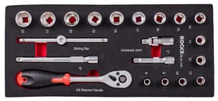 Zestaw narzędziowy 3/8", 20 cz. Zestaw Kluczy nasadowych 3/8", składa się z 20 elementów wykonanych z wysokiej jakości stali chromowo-wanadowej. Wszystkie elementy umieszczone są w wytłoczonym wkładzie piankowym dopasowanym wymiarami do 1/3 powierzchni szuflady w warsztatowej szafce narzędziowej. Wkład piankowy wykonany jest z wysokiej jakości pianki odpornej na olej i chemikalia i dzięki precyzyjnemu wyprofilowaniu zapewnia stały porzadek w narzędziach.