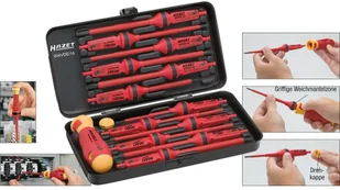 Wyposażenie: Spełnia wymogi bezpieczeństwa zgodnie z wymogami normy DIN ISO 60900 $14 Wszystkie wkrętaki przetestowane 10 000 V, zapewniają bezpieczną pracę do 1000 V $15 Ergonomiczny uchwyt HAZET wykonany z 2 rodzajów tworzyw sztucznych, w kolorach czerwonym i żółtym $16 Ostrze okrągłe $17 Skrzynka metalowa $18 Powierzchnia: izolacja ochronna $19 Made in Germany $20 do profilu rowkowego 2,5 x 0,4 3,0 x 0,5 3,5 x 0,6 4,0 x 0,8 5,5 x 1,0 6,5 x 1,2 - dla profilu gniazda krzyżowego (PH) PH 1 PH 2 - do profilu Pozidriv (PZ) PZ 2 - do wewnętrznego profilu TORX(R) T 10 T 15 T 20 $21 Końcówka: Profil Pozidriv PZ, Profil gniazdo krzyżowe PH, Profil z gniazdem sześciokątnym, wewnętrznym, Profil szczelinowy $22 izolacja ochronna do 1000 V $23 Masa netto: 09 kg $24 Stabilne trzymanie grotów w uchwycie, automatyczna blokada przed przypadkowym wyciągnięciem $25 Nakładany kapturek obrotowy oraz pierścień z miękkiej okładziny dla ułatwienia zastosowania jako precyzyjne narzędzia $26 Pierwszy kompaktowy zestaw narzędzi elektrotechnicznych z atestem VDE przeznaczony (nie tylko) dla elektryków $27 Znakomita funkcjonalność i jakość $28 Liczba narzędzi: 14 Sztuka