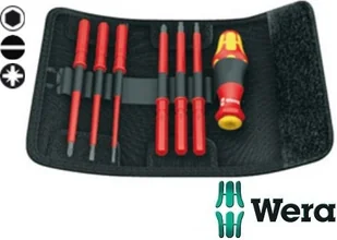 6 wymiennych trzpieni izolowanych VDE z rękojeścią Kraftform 817 VDE w wytrzymałym etui do mocowania na pasku. Każde narzędzie testowane pojedynczo zgodnie z IEC 60900. Indywidualnie kontrolowana izolacja poprzez zanurzenie w kąpieli wodnej pod napięciem 10000 V gwarantuje bezpieczeństwo pracy pod napięciem 1000 V. 6 wymiennych trzpieni izolowanych VDE dł.