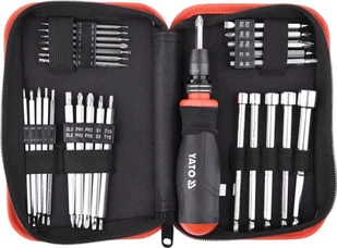 Wkrętak z wymiennymi końcówkami marki YATO YT-24940, zestawem bitów, bitów precyzyjnych i nasadek.