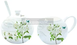 komplet: cukiernica, mlecznik oraz łyżeczka, w kolorze białym wykonane z porcelany. Komplet ozdobiony motywami kolorowych kwiatów. Całość jest zapakowana w eleganckie pudełko. Wysokość mlecznika: 7 cm, srednica: