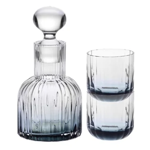 Każda sztuka wchodząca w skład zestawu została uformowana ręcznie przez mistrzów hutnictwa, z wykorzystaniem najczystszego bezołowiowego kryształu, zapewniając nieskazitelny blask i jedwabistą gładkość. Kształt karafki to historyczny projekt, odtworzony w oryginalnych żeliwnych formach datowanych na 1948 rok, co nadaje całości unikalnego charakteru. Solidne dno karafki i szklanek oprawione jest w delikatną kroplę koloru Akwamaryn – subtelnego błękitu, który przywołuje spokój czystej wody. Ten orzeźwiający odcień wprowadza do wnętrza świeżość i zrównoważoną elegancję. Pionowe ryflowanie, uzyskane precyzyjnie podczas formowania, nie tylko optycznie wydłuża formę, ale przede wszystkim jest wyczuwalną fakturą, dodając naczyniom rzemieślniczego wyrazu.