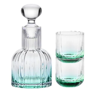 Każda sztuka wchodząca w skład zestawu została uformowana ręcznie przez mistrzów hutnictwa, z wykorzystaniem najczystszego bezołowiowego kryształu, zapewniając nieskazitelny blask i jedwabistą gładkość. Kształt karafki to historyczny projekt, odtworzony w oryginalnych żeliwnych formach datowanych na 1948 rok, co nadaje całości unikalnego charakteru. Solidne dno karafki i szklanek oprawione jest w delikatną kroplę koloru Akwamaryn – subtelnego błękitu, który przywołuje spokój czystej wody. Ten orzeźwiający odcień wprowadza do wnętrza świeżość i zrównoważoną elegancję. Pionowe ryflowanie, uzyskane precyzyjnie podczas formowania, nie tylko optycznie wydłuża formę, ale przede wszystkim jest wyczuwalną fakturą, dodając naczyniom rzemieślniczego wyrazu.