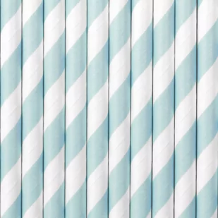 "Słomki papierowe w kolorze jasnoniebieskim z białymi ukośnymi paskami, długość ok. 19,5 cm.(1 op. / 10 szt.