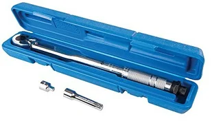 Wykonana ze stali chromowo-wanadowej z odwracalną głowicą zapadkową. Radełkowany uchwyt nastawczy i pierścień blokujący dla dokładnego ustawienia momentu dokręcania. Wyprodukowane zgodnie z normami EN ISO 6789 i DIN 3121. Dokładność: +/-4%. Z przedłużką, adapterem napędu i pudełkiem do przechowywania.
