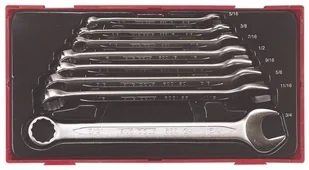 Klucze oczkowo-płaskie, calowe, Teng-tools. Klucze zostały wykonane ze stali chromowo-wanadowej. Ten sam rozmiar na obu końcach. Główka pierścieniowa dwunastokątna, odgięta pod kątem 15°. Główki szlifowane.