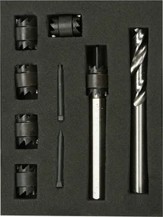 Profesjonalny zestaw przeznaczony do szybkiego usuwania zgrzewów, spawów, spoin karoserii samochodowej. Zawiera 6 dwustronnych frezów koronkowych, uchwyt mocujący, 3 trzpienie ustalające oraz specjalne wiertło HSS 8 mm. Parametry