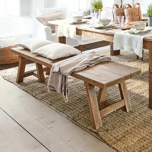 Mała uroczystość z przyjaciółmi i rodziną na zewnątrz wśród zieleni lub na własnym tarasie – ten dekoracyjny i praktyczny element sprawdzi się przy każdej okazji. Dzięki naturalnie pięknemu usłojeniu odzyskanego drewna sosnowego ławka wygląda rustykalnie i naturalnie, niczym wprost z warsztatu mistrza rzemiosła. Urzeka uroczym i przejrzystym designem. Specjalne trójkątne nóżki sprawiają, że jest bardzo stabilna na różnych powierzchniach, takich jak beton czy trawa. Dzięki wyjątkowej długości oferuje więcej miejsca dla gości niż konwencjonalna ławka i bardzo dobrze komponuje się ze stołami takimi jak model 20636.