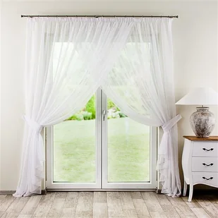 Piękna i niezwykle elegancka dekoracja okna wykonana z wysokiej jakości gładkiego woalu w kolorze białym lub ecru. Składa się z dwóch firan suto zmarszczonych taśmą i zszytych razem na tzw. "zakładkę" . U dołu doszyta jest obciążająca ołowianka. Do kompletu dołączone są dwie podwiązki umożliwiające podpięcie firan.