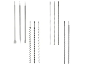 ok. 13,2 x 600 x 20 mm (szer. x dł. x wys.), dłuto płaskie szerokie: ok. 13,2 x 600 x 40 mm (szer. x dł. x wys.) zestaw wierteł ślimakowych : ok. 12 / 16 / 20 x 600 mm (Ø x dł.) zestaw wierteł do kamienia 3-częściowy : ok. 10 / 12 / 16 x 600 mm (Ø x dł.) zestaw wierteł do kamienia 2-częściowy : ok. 22 / 25 x 600 mm (Ø x dł.) Waga: