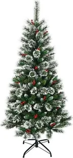 Sztuczna choinka COSTWAY 150 cm z czerwonymi jagodami, ośnieżona choinka z metalowym stojakiem, choinka z PVC i igieł jodłowych, sztuczna choinka z systemem składania