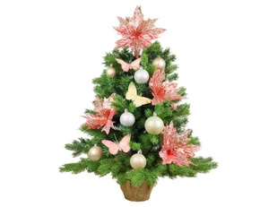 Ostatnie wolne miejsca są wypełnione okrągłymi ozdobami. Szczyt choinki jest ozdobiony różowym kwiatem. Skład zestawu 1 x udekorowana choinka 60 cm z oświetleniem LED 1 x stojak na choinkę owinięty jutą Zestaw ozdób i dekoracji zawiera 15 x okrągłe ozdoby 4 - 6 cm mix, kolor szampańsko-srebrny, materiał plastik - ECO FRIENDLY 12 x motyl na klipsie 10 cm mix, kolor różowo-brązowy, materiał plastik i metal 8 x kwiat bez klipsa 20 x 23 cm, kolor różowy, materiał tekstylny 1 x wstążka 1 x kokarda 20 x 23 cm, kolor srebrny, materiał tekstylny 35 szt. ozdoby i dekoracje Dlaczego warto kupić udekorowaną choinkę? 1. otrzymasz drzewko już udekorowane.