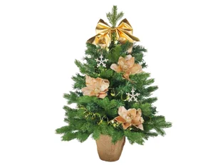 Wierzchołek drzewka ozdobiony jest eleganckimi kokardami. Skład zestawu 1 x udekorowana choinka 60 cm z oświetleniem LED 1 x stojak na choinkę owinięty jutą Zestaw ozdób i dekoracji zawiera 5 x kwiat 17 cm, kolor kremowy, materiał tekstylny 4 x płatek śniegu i gwiazda z dżetów 4 cm, kolor przezroczysty, materiał plastik 1 x łańcuch spiralny 2 m, kolor złoty, materiał plastik i metal 1x kokarda 20 x 23 cm, kolor szampański, materiał plastik 11 sztozdoby i dekoracje Dlaczego warto kupić udekorowaną choinkę? 1. drzewko otrzymasz już udekorowane. 2. wystarczy wyjąć je z pudełka, lekko dopasować gałęzie za pomocą ozdób i drzewko jest gotowe. 3. Oszczędzaszczas, nie musisz samodzielnie dekorować drzewka.