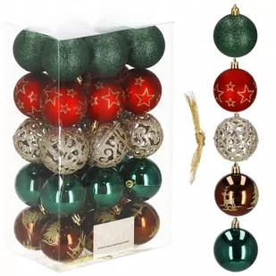 połyskujące / brokatowe / teksturowane Sznureczki do zawieszenia - w zestawie Wymiary: Średnica bombek: 6 cm Wysokość całkowita: 7 cm W skład zestawu wchodzi: 6x bombki połyskujące - brązowe + złote brokatowe wzorki - 6 cm 6x bombki połyskujące - szmaragdowe - 6 cm 6x bombki teksturowane, brokatowe - złote - 6 cm 6x bombki matowe - czerwone + złote gwiazdki brokatowe - 6 cm 6x bombki brokatowe - zielone - 6 cm Kod produktu: