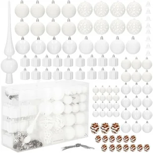 Gratisowe sznureczki pozwalają na łatwe zamocowanie ich w wybranym przez siebie miejscu. Idealny zestaw do dekoracji stroika, uzupełnienia zawieszek na choinkę oraz podarowania prezentu. W zestawie znajdują się następujące bombki: 8x bombka biała brokatowa - 6 cm 4x bombka biała błyszcząca - 6 cm 4x bombka biała matowa - 6 cm 8x bombka biała ażurowa - 6 cm 18x bombka prezencik - ok. 4 cm 12x bombka błyszcząca - 4 cm 6x bombka brokatowa 4 cm - 6 cm 8x bombka połyskująca - 3 cm 8x bombka brokatowa - 3 cm 8x bombka dzwoneczek - 3,5 cm 15x szyszki w różnych rozmiarach od 1,5 cm do 3 cm A także:
