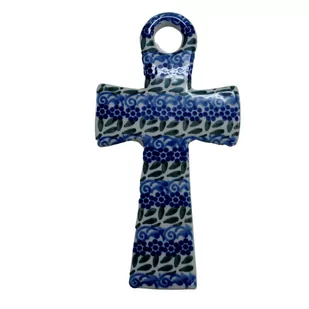 Krzyż wiszący (A235 D75) Oryginalne ceramiczne krzyżyki wiszące, ręcznie malowane w rodzinnej fabryce ceramiki artystycznej w Bolesławcu, ANDY Ceramika. Krzyż na ścianę z możliwością zawieszenia, dzięki otworowi w górnej części krzyża. Stanowi idealny dodatek również do świątecznych stroików na stół czy jako element dekoracji ściennej domu. Krzyże ceramiczne to ozdoby i symbole religijne, ręcznie malowanie w tradycyjne i unikatowe wzory ceramiki artystycznej. Krzyż ceramiczny doda elegancji twojego wystroju domu i sprawi, że tradycyjny krzyż drewniany bądź metalowy zostanie zastąpiony krzyżykiem ceramicznym.