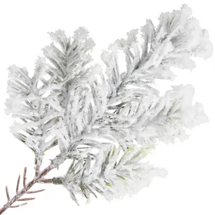 Sztuczny świerk na gałązce wykonany z tworzywa sztucznego pokryty białym meszkiem z brokatem. Od spodu pojawia się także ciemna oraz jasna zieleń. Świerk ma długość 26cm, a brązowa łodyżka 11cm. Szerokość całej gałązki to ok. 10cm - może to różnić się w przypadku innego ułożenia się gałązek.