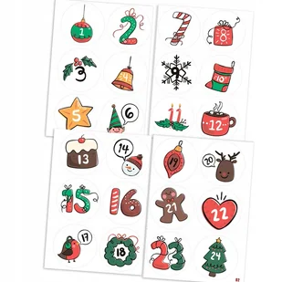 NA TEJ AUKCJI KUPUJESZ 4 ARKUSZY Z NAKLEJKAMI WYMIARY ARKUSZA: A6 10,5 x 15 CM Naklejki ponacinany w kółeczka, średnica każdej z naklejek to ok 4,5 cm 24 szt Kalendarz adwentowy świetnie sprawdzą się przy dekorowaniu kartek świątecznych, jak również prezentów Pozwala realizować twórcze pomysły i tworzyć kreatywne wyroby w szybki i łatwy sposób. Arkusze naklejek świetnie sprawdzą się do wykonywania różnych prac plastycznych, scrapbookingowych czy decoupageowych-kartek okolicznościowych, pudełek, albumów, dyplomów, podziękowań i wielu, wielu innych. Znajdziesz je u nas w różnych kolorach i wzorów do wyboru. PRZEZNACZONE DLA DZIECI POWYŻEJ 3 LAT.