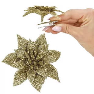 Poinsecja, czyli inaczej gwiazda betlejemska to produkt mocno kojarzący się z okresem Świąt Bożego Narodzenia. Jej urok tkwi przede wszystkim w pięknych, rozłożystych listkach z charakterystycznymi rożkami. Złoty, sztuczny kwiat dostępny w naszej ofercie dodatkowo przyozdobiony został brokatem, który podkreśla niesamowity wygląd dekoracji. Gwiazda betlejemska stanowi nie tylko piękną ozdobę samą w sobie, ale także efektowny dodatek do stroików czy urozmaicenia wyglądu choinki. Kwiat przymocowany na klipsie znacznie ułatwi ulokowanie poinsecji w różnych miejscach. Warto też zwrócić uwagę na materiał z jakiego wykonano listki - dzięki niemu kwiat wygląda bardzo realistycznie.