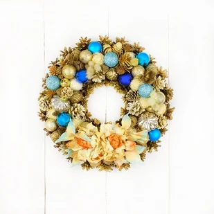 Skład wianka: 67% Natury: 33% szyszki sosny 9% grążel zielony suszony 6% żołędzie 5% szyszki modrzewia 5% dmuszek z własnej uprawy 4% szyszki olchy 3% potpourri 2% buk 10% Świąteczne dekoracje 22% Kwiaty a ...