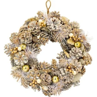 Jak stworzyć elegancki i świąteczny klimat jednym dodatkiem? Wianek dekoracyjny MICA 34 cm to gotowa ozdoba z naturalnymi szyszkami i złotymi akcentami, która natychmiast wprowadzi blask, styl i atmosferę Bożego Narodzenia do Twojego domu. Wianek dekoracyjny MICA 34 cm to klasyka w nowoczesnym wydaniu – zielone gałązki w połączeniu z subtelnymi dekoracjami sprawiają, że pasuje zarówno do tradycyjnych, jak i minimalistycznych wnętrz.