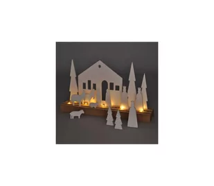 drewno - kolor: biały, brązowy Drewniana modułowa wioska zimowa LED z 15 elementami świątecznymi, które można umieścić na podstawie. Dekoracja wymaga zakupu baterii ołówkowych AAA, które nie są dołączone do zestawu.