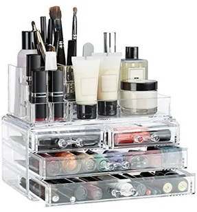 Organizer do makijażu w szczegółach - Zestaw 2 pojedynczych części - Wymiary wys. x szer. x gł. : ok. 19 x 23,5 x 14 cm - Liczba półek: 12 - Waga: ok. 1,2 kg - Materiał: akryl - Kolor: biały lub przezroczysty Organizer na kosmetyki z wieloma półkami - 2x szeroka szuflada wys.