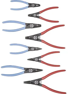 Zestaw szczypiec do pierścieni osadczych wewnętrznych i zewnętrznych z prostymi i kątowymi 90° końcami Szczególnie nadaje się do pracy w trudno dostępnych miejscach. Szczypce ze sprężyną otwierającą, zabezpieczone i z lekkim uchwytem.